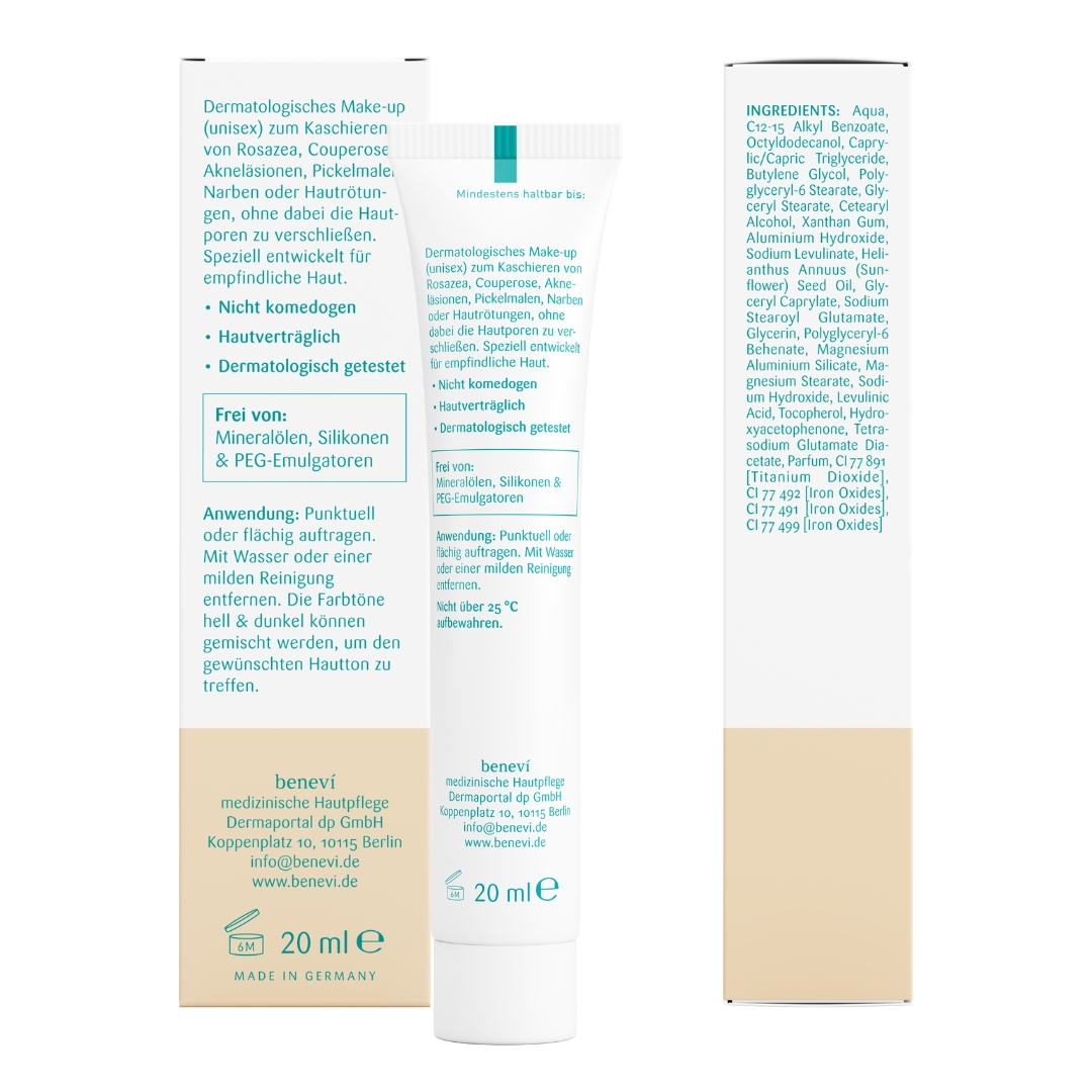 benevi color Pigment-Creme dunkel: Make-up-Ersatz zum zuverlässigen Abdecken von Rötungen, Rosazea, Akne, Pickelmalen und Narben – ohne die Hautporen zu verschließen. Die leichte Textur ist nicht komedogen, lässt sich gleichmäßig auftragen und beschwert die Haut nicht.