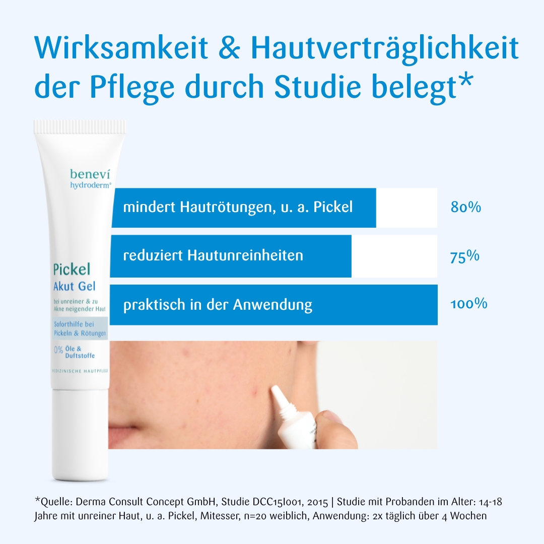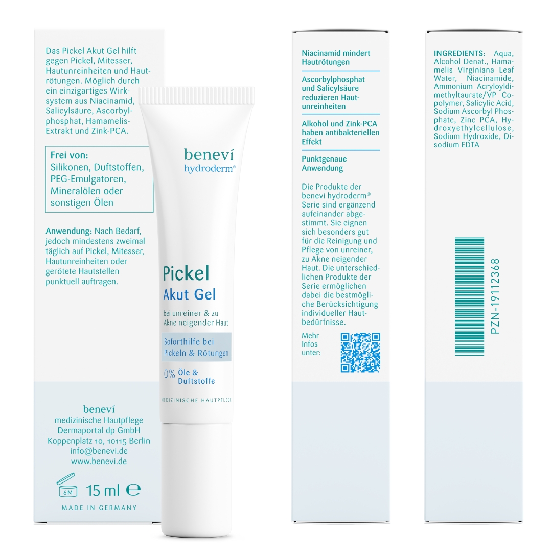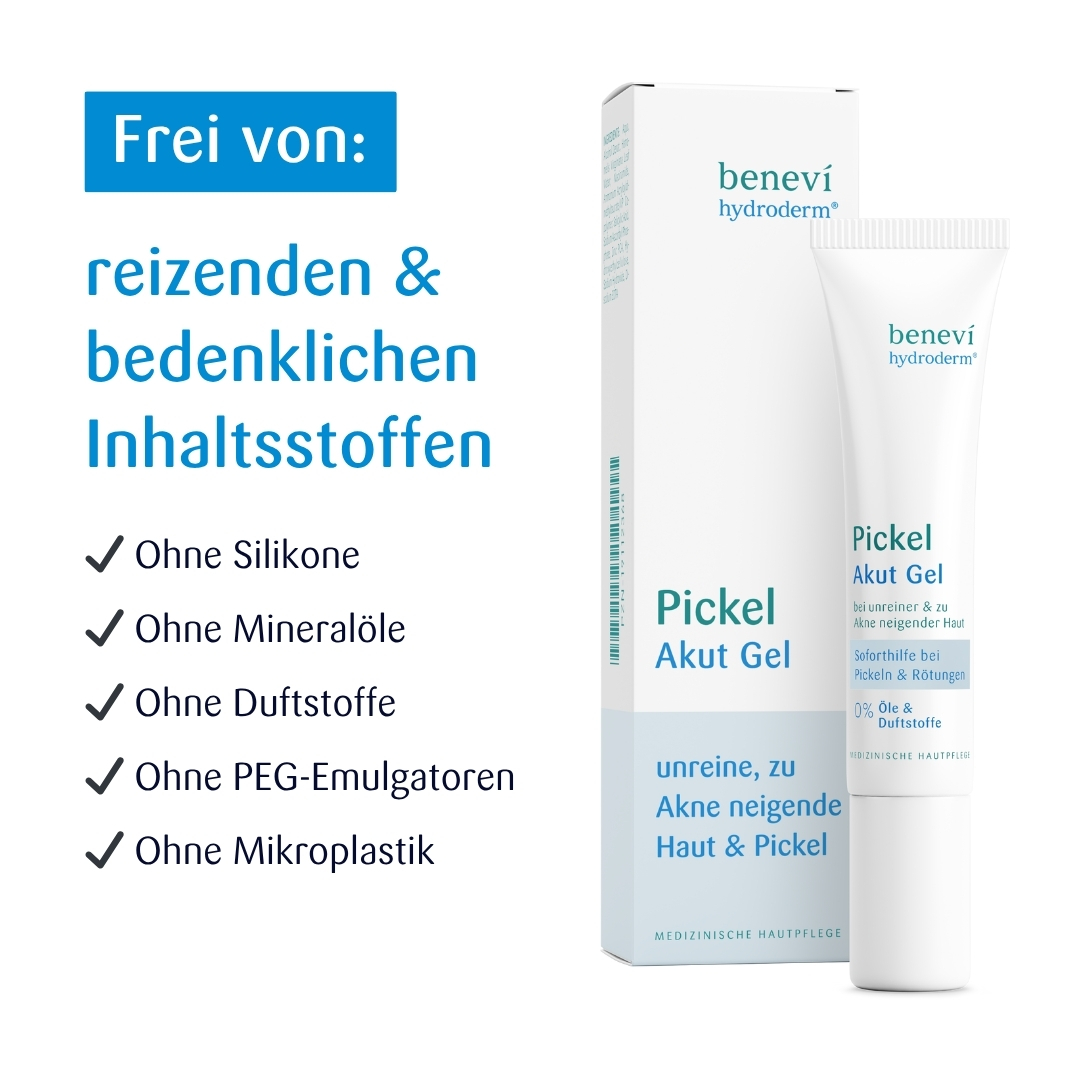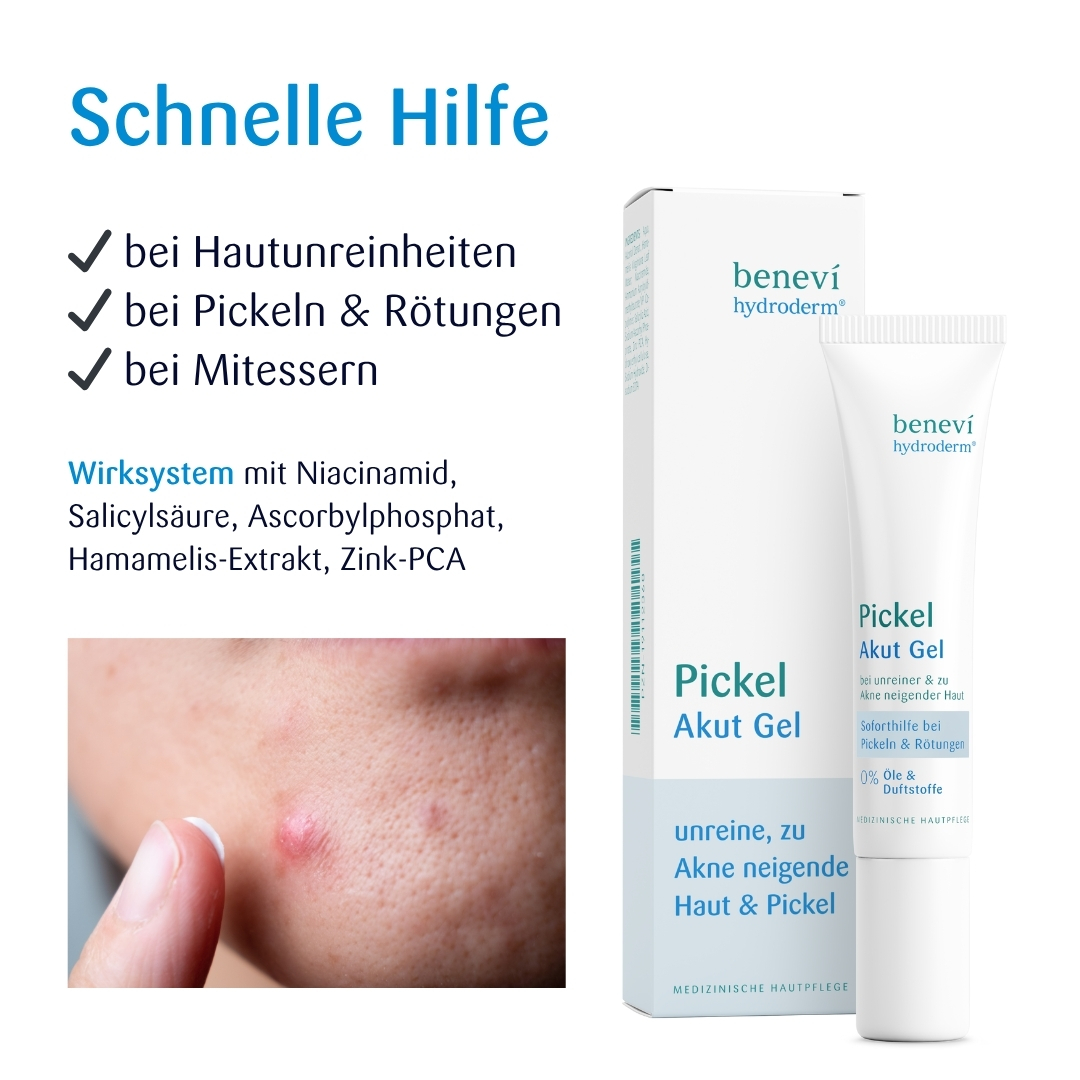 benevi hydroderm Pickel Akut Gel ist ein fettfreies SOS-Gel zur gezielten Anwendung bei einzelnen Pickeln.