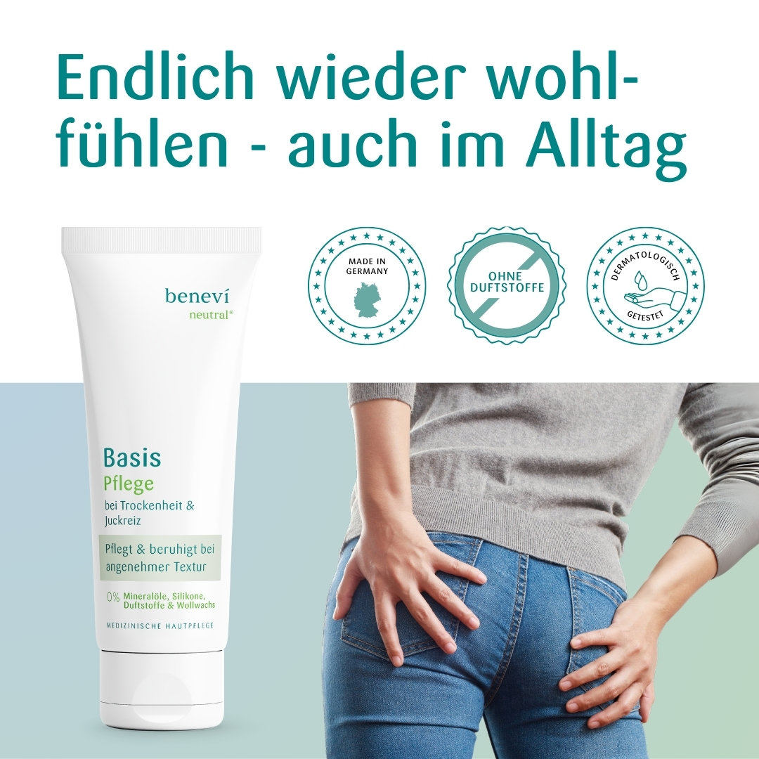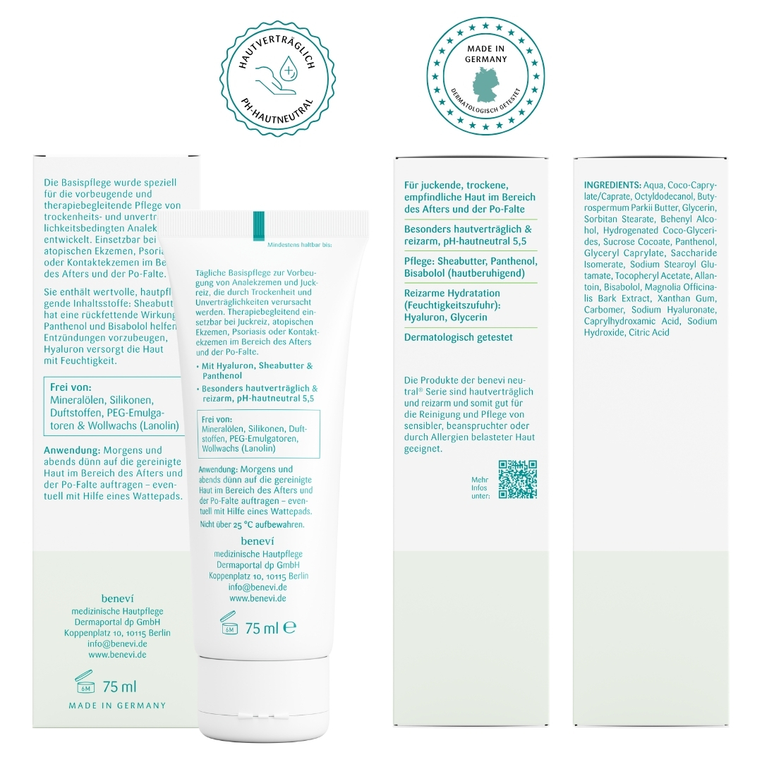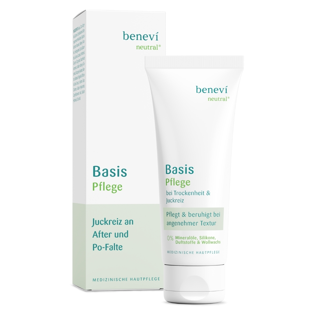Die benevi neutral Basis Pflege wurde speziell für die tägliche Anwendung im empfindlichen Analbereich und der Po-Falte entwickelt. Sie eignet sich ideal zur Pflege bei durch Trockenheit, Reibung oder äußere Reize bedingtem Juckreiz sowie bei Neigung zu Analekzemen.