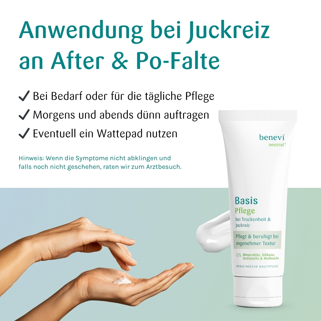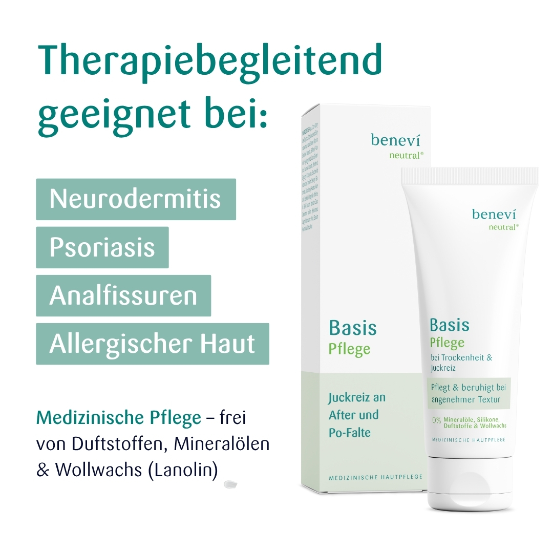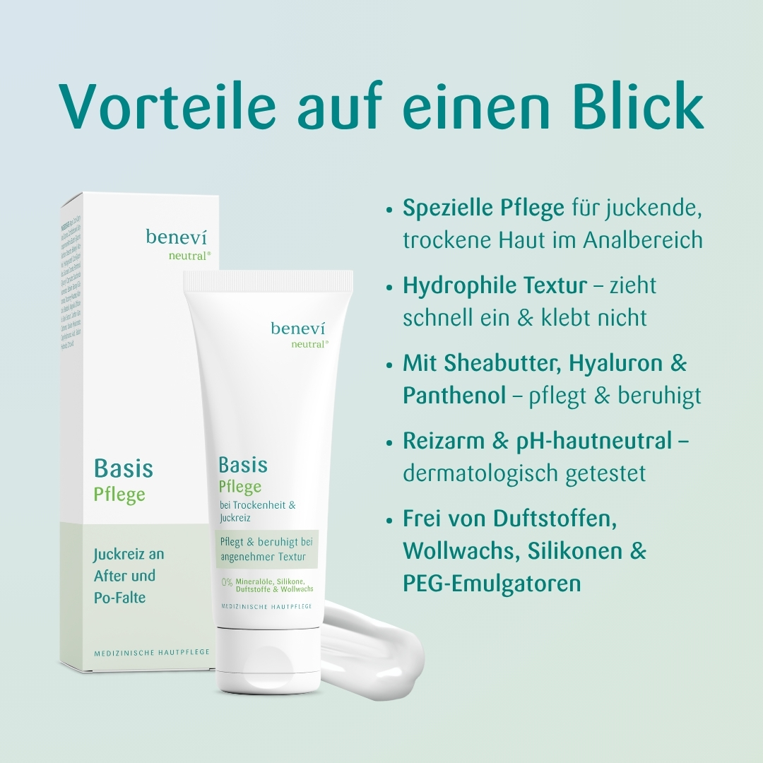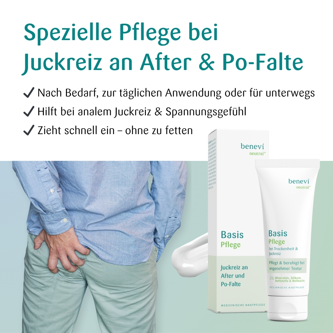 Die benevi neutral Basis Pflege wurde speziell für die tägliche Anwendung im empfindlichen Analbereich und der Po-Falte entwickelt. Sie eignet sich ideal zur Pflege bei durch Trockenheit, Reibung oder äußere Reize bedingtem Juckreiz sowie bei Neigung zu Analekzemen.