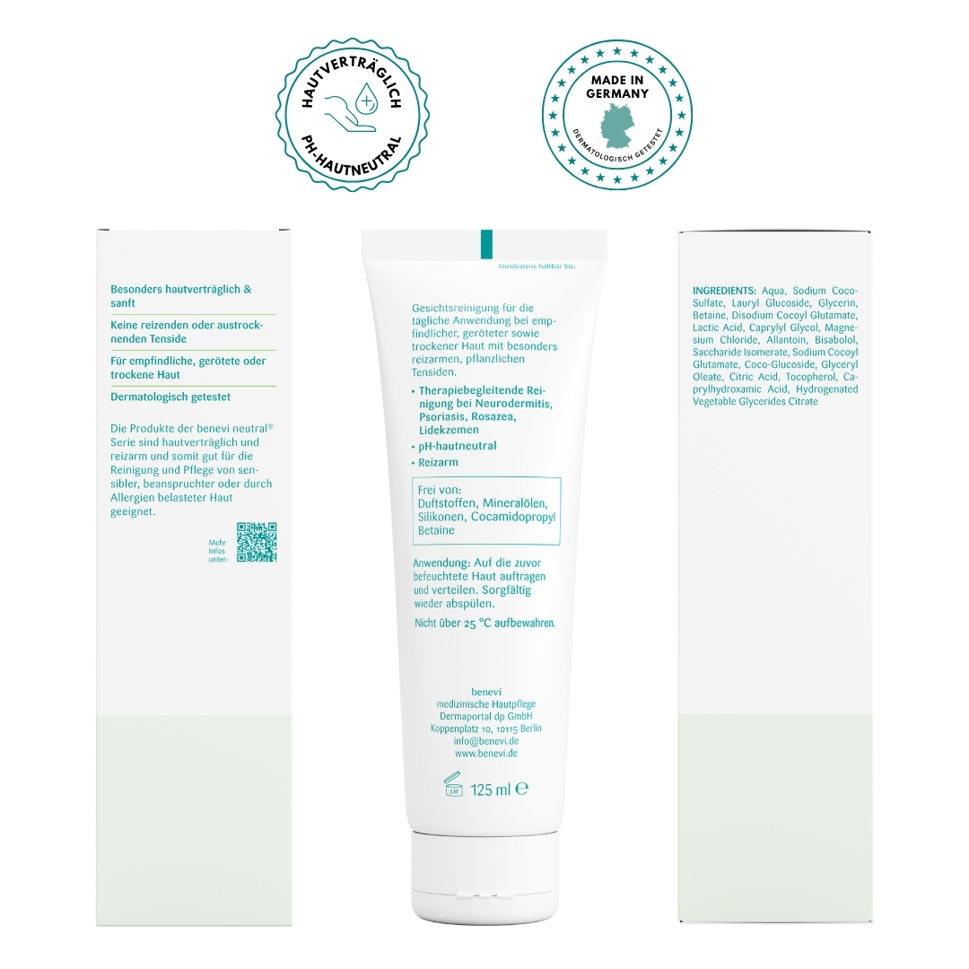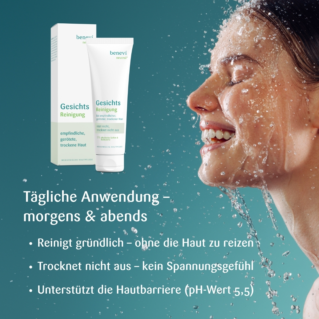 Die sulfatfreie Formulierung von benevi neutral Gesichtsreinigung kommt ohne austrocknende oder reizende Tenside aus und bewahrt mit einem hautneutralen pH-Wert von 5,5 das natürliche Mikrobiom.