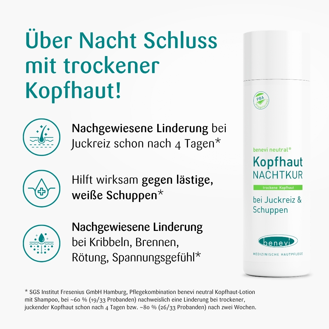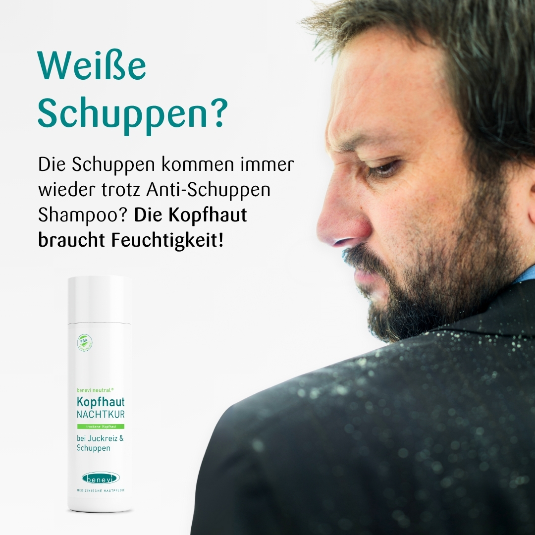 Trockene Kopfhaut zählt zu den häufigsten Ursachen für Juckreiz und weiße Schuppen. Die benevi neutral Kopfhaut-Nachtkur wurde speziell für die Anwendung über Nacht entwickelt: Sie spendet intensive Feuchtigkeit, beruhigt gereizte Hautpartien und hilft so, Juckreiz und Schuppenbildung zu mindern – ganz gezielt bei trockener und empfindlicher Kopfhaut.